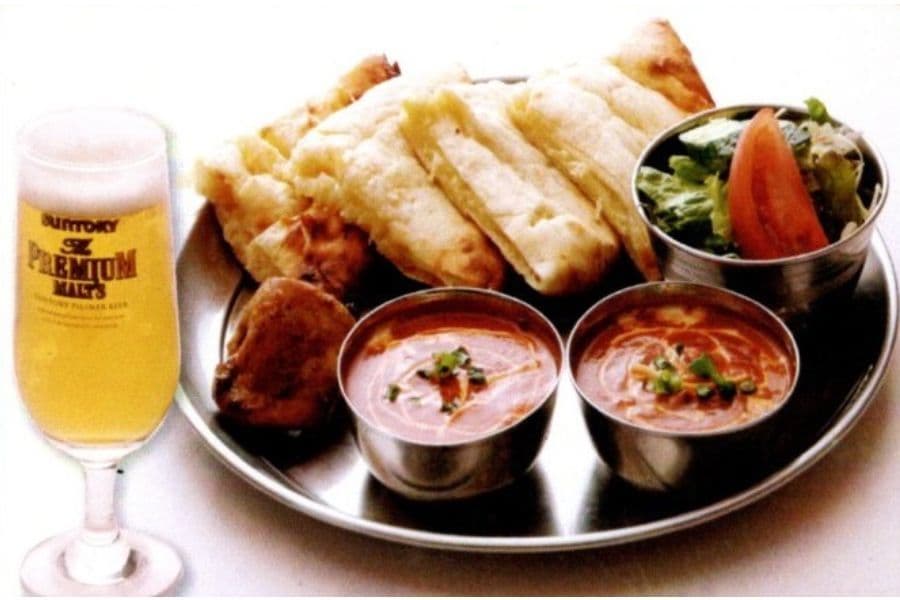 2種類のカレー、チーズナン、マライティッカ、サラダ、ドリンクorビール