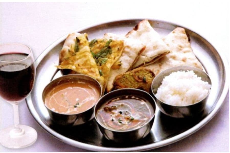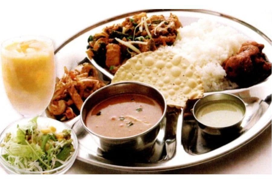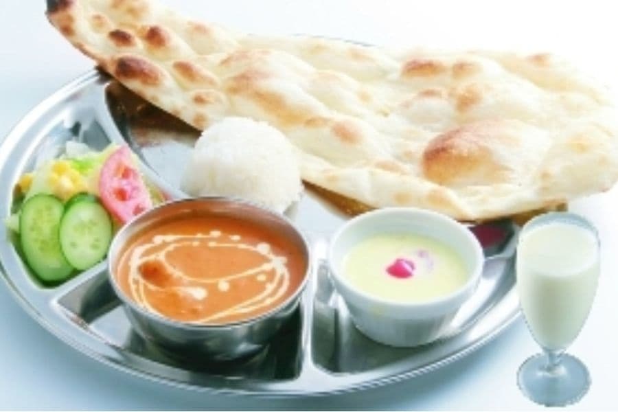 2種類のカレー(バターチキン、チキン、マトン、ミックスベジタブル、キーマシュリンプから選択)、ナン、ライス、タンドリーチキン、シークカバブ、サラダ、ラッシー