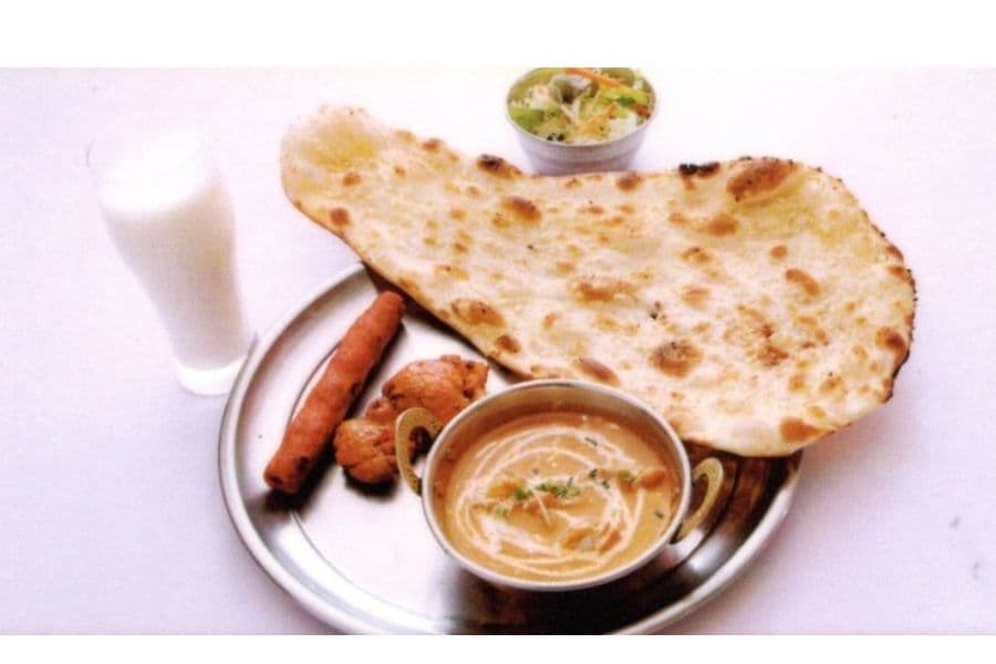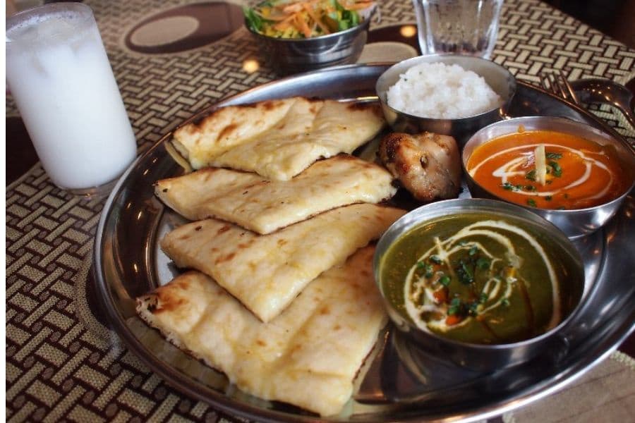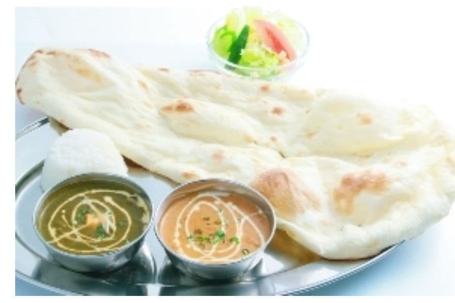 2種類のカレー、ナン(またはライス)、タンドリーチキン、シークカバブ、サラダ、ドリンク