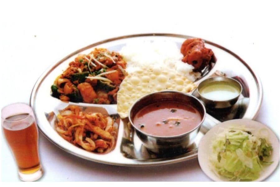 ダル(豆のスープ ※ダルはセットメニューのカレーへ変更可能)、バート(ごはん)、タルカリー(野菜の炒め物)、パパド、サラダ、アチャール(野菜の漬物)、ドリンク