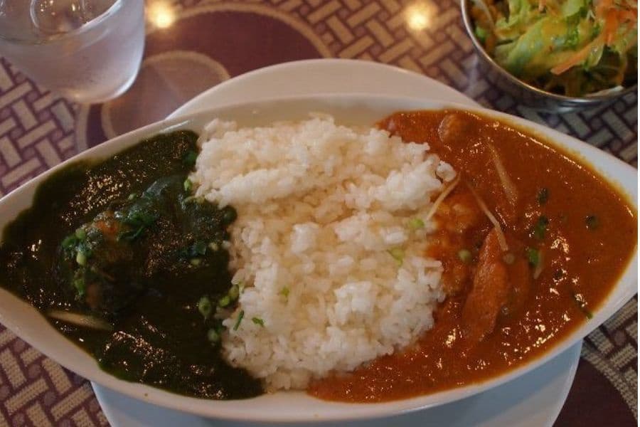 2種類のカレー、チーズナン、マライティッカ、サラダ、ドリンク